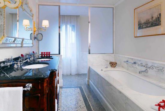 The bathroom continues the opulence with marble tiling, a sleek bath and shower combination, customised lotions, shampoos and conditioners by Laura Tonatto, plush bathrobes and slippers, a salon-style hairdryer and a make-up mirror.