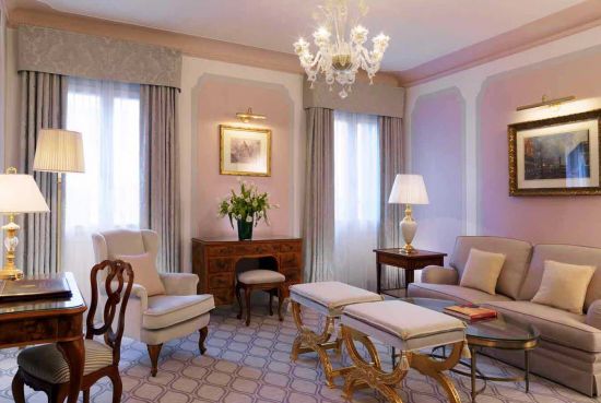 Exquisite glass lamps in the Dandolo Suite living room, have been crafted locally on the lagoon island of Murano, casting their glow from side tables and an extravagant multi-armed chandelier overhead.